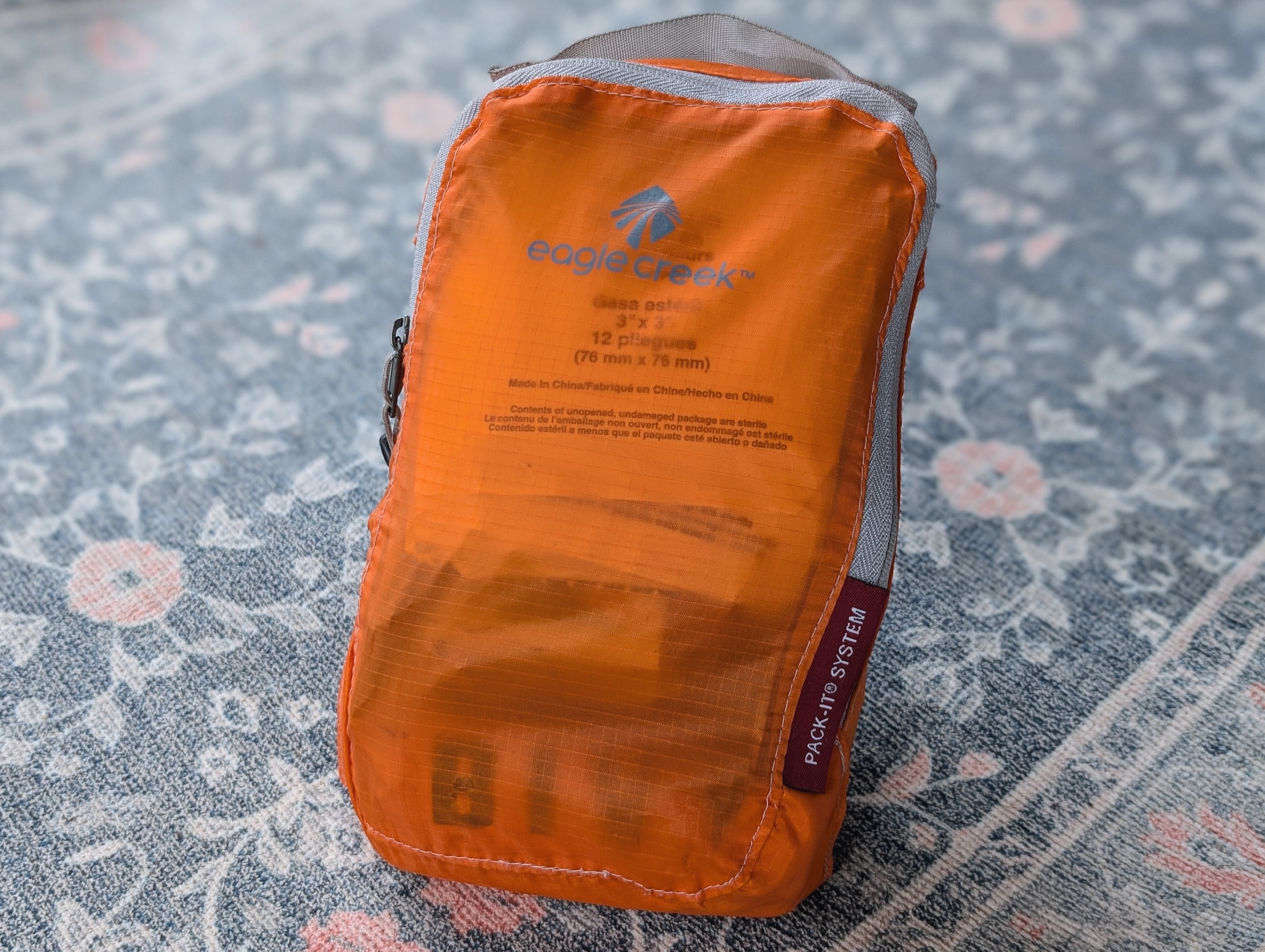 I’ve built my kit to fit into a small Eagle Creek packing cube. They don’t make the Specter series anymore, but the Isolate line is similar and there are dozens of comparable options from other brands. These pouches are lightweight, but durable. The 3/4 length zipper makes it easy to get at the contents quickly and the bright color helps me quickly find it in my pack or on the ground.