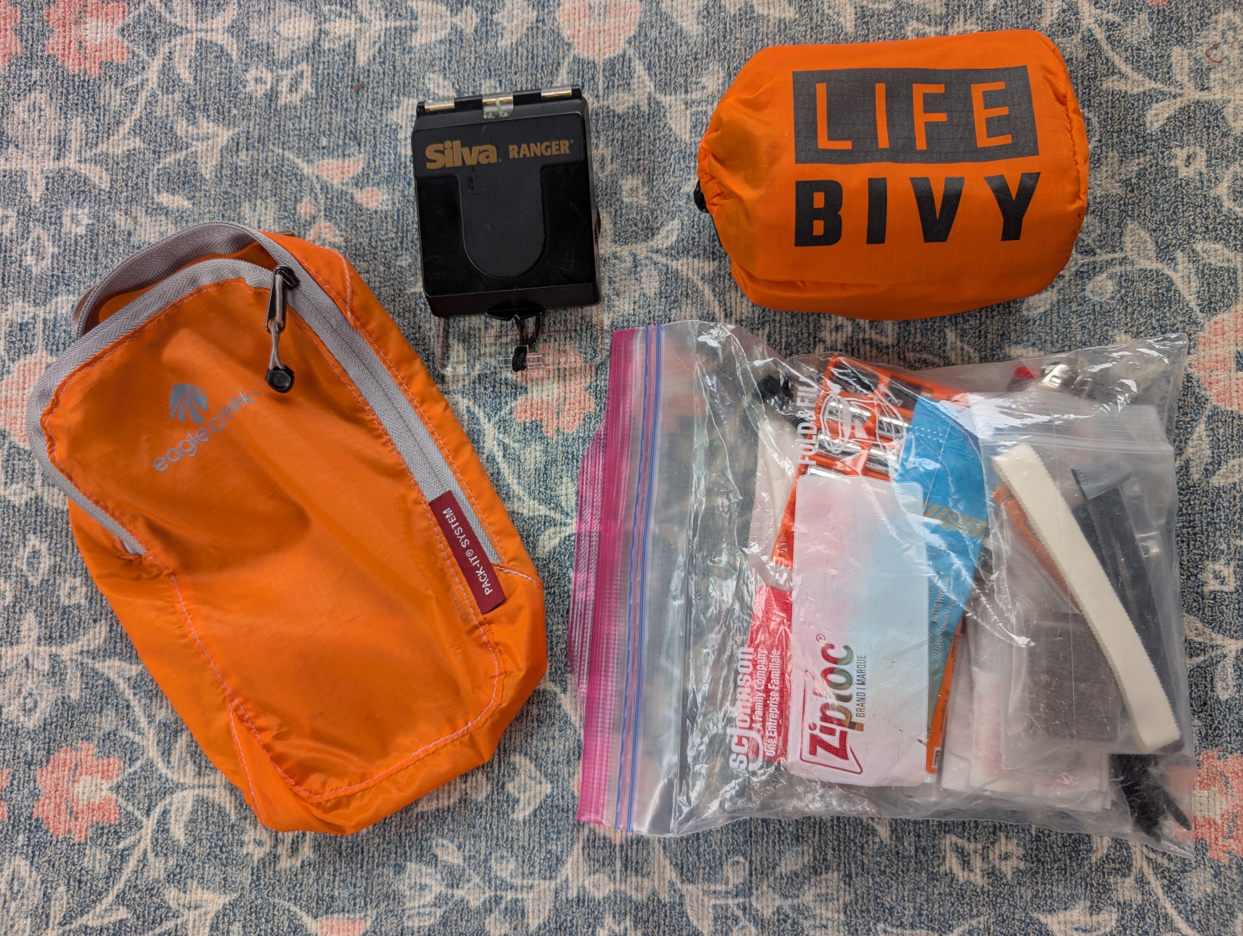 All in, the pouch measures 9” × 5” × 2.5” and weighs around 14 ounces. Inside is a quart-sized Ziploc bag that holds most of the contents, an emergency bivvy, and a compass with signal mirror. Digging into the ziplock, we start to get to the fundamental components of the kit.