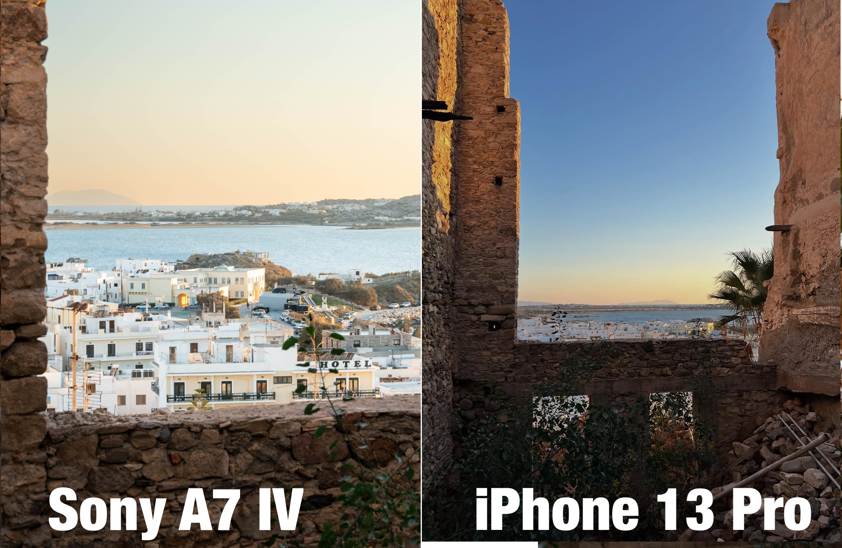 Here’s a practical example from our trip to Greece to illustrate the benefit of interchangable lenses. On the left is a photo I shot with the A7IV at 70mm. On the right is a photo my wife took with her iPhone 13 Pro. The background compression from the longer lens pulls the village into the image
